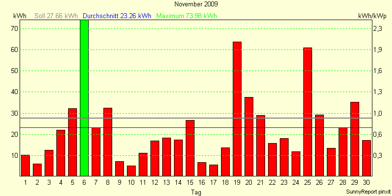 | Datum | Ertrag absolut [kWh] | Ertrag spezifisch [kWh/kWp] | Ertrag/Soll [%] |