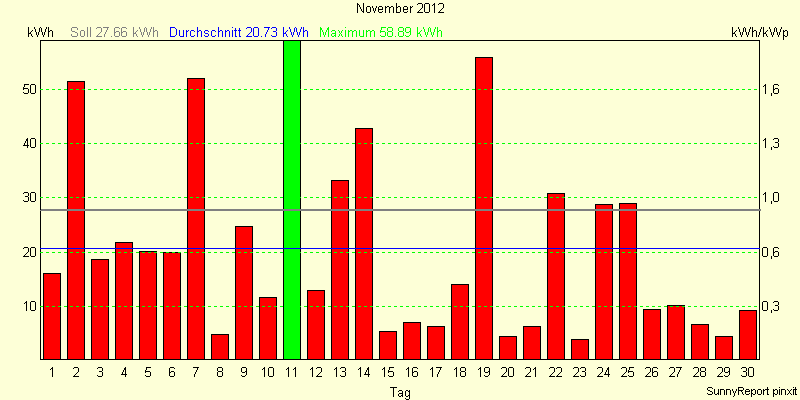 | Datum | Ertrag absolut [kWh] | Ertrag spezifisch [kWh/kWp] | Ertrag/Soll [%] |
