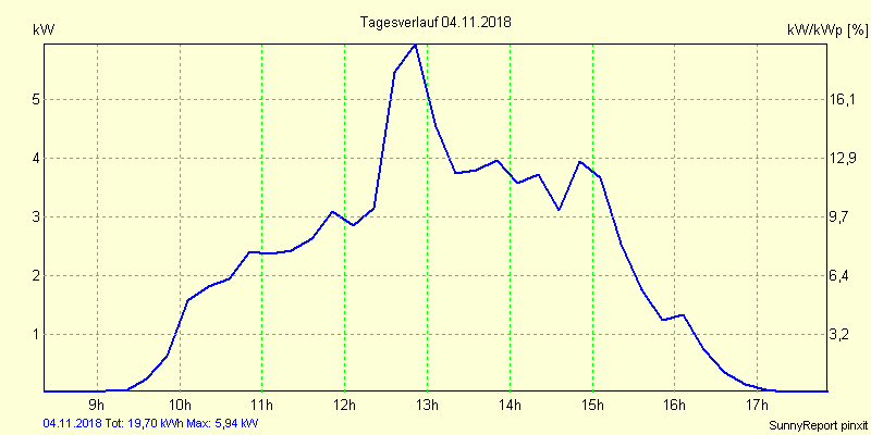 | Datum | Ertrag absolut [kWh] | Ertrag spezifisch [kWh/kWp] | Ertrag/Soll [%] |