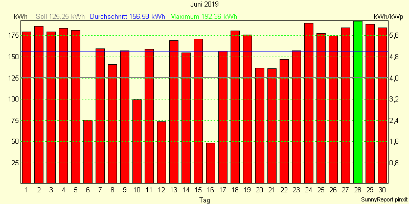 | Datum | Ertrag absolut [kWh] | Ertrag spezifisch [kWh/kWp] | Ertrag/Soll [%] |