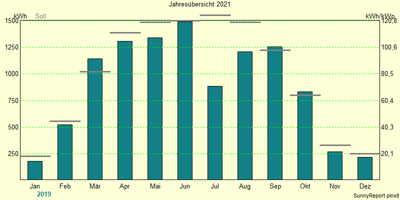 | Monat | Ertrag absolut [kWh] | Ertrag spezifisch [kWh/kWp] | Ertrag Soll [kWh] | Ertrag/Soll [%] |