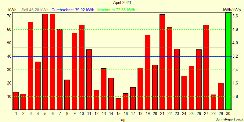 | Datum | Ertrag absolut [kWh] | Ertrag spezifisch [kWh/kWp] | Ertrag/Soll [%] |