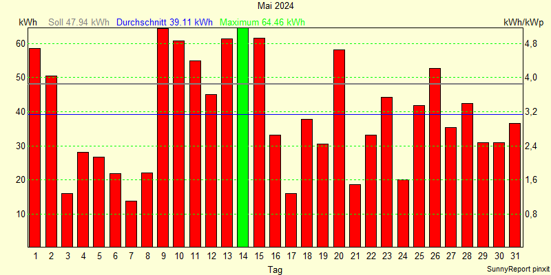 | Datum | Ertrag absolut [kWh] | Ertrag spezifisch [kWh/kWp] | Ertrag/Soll [%] |